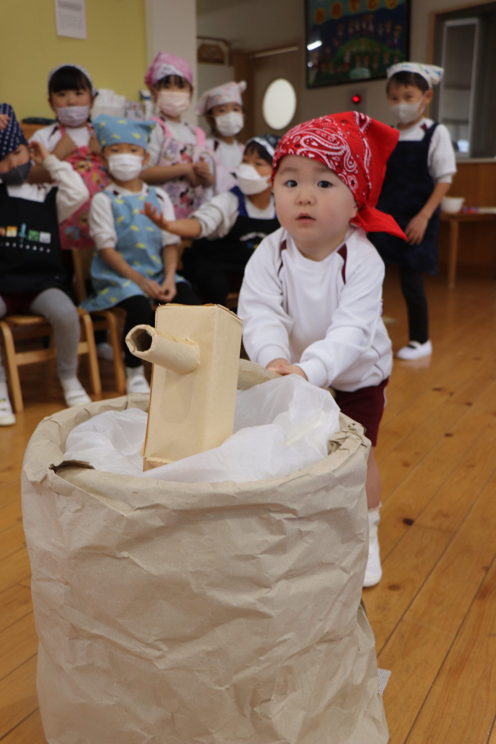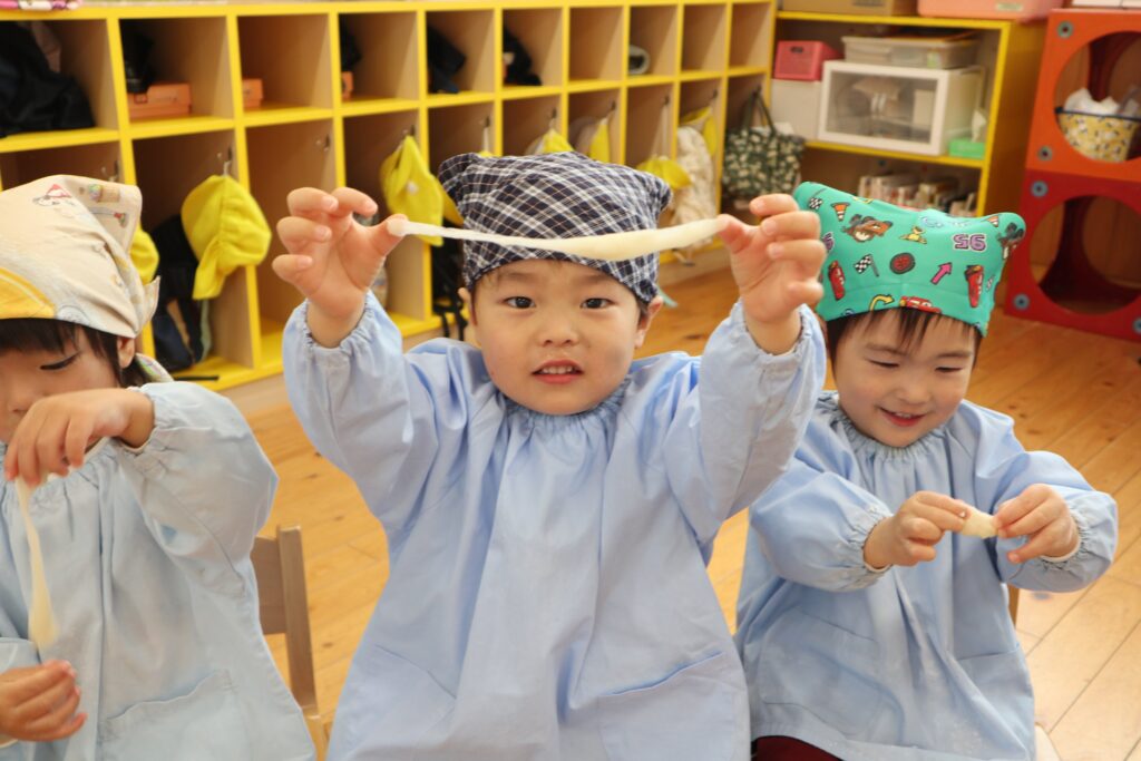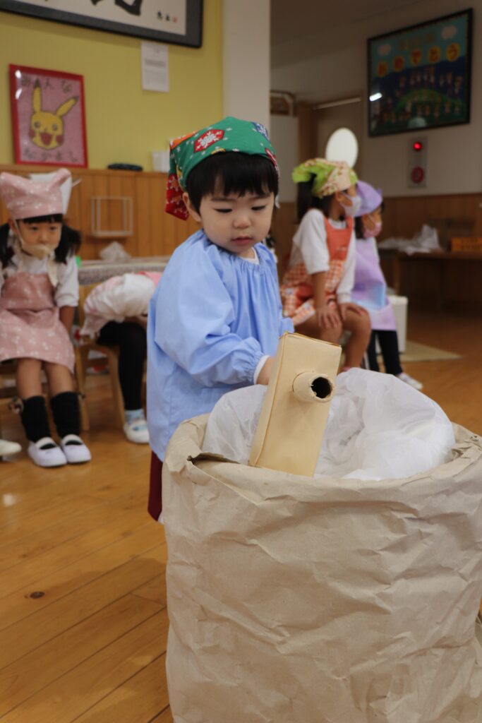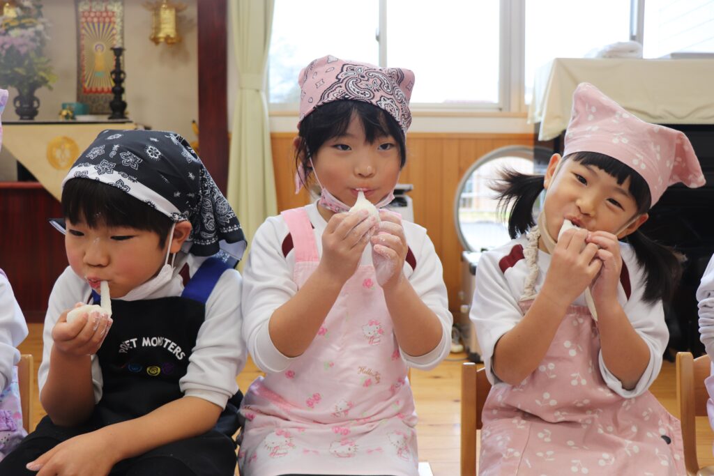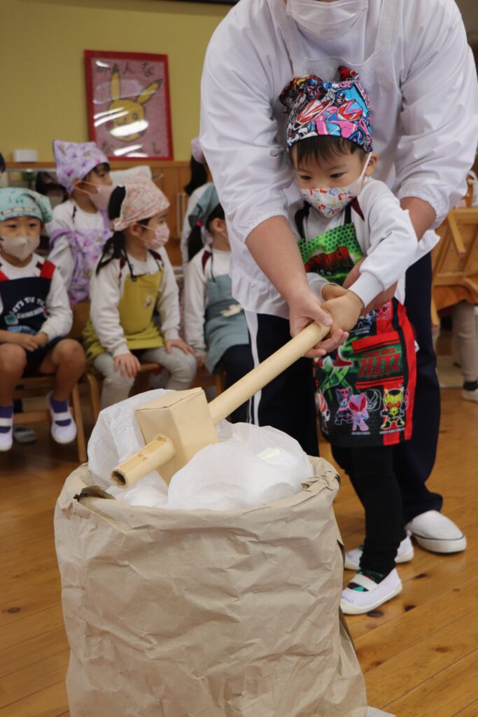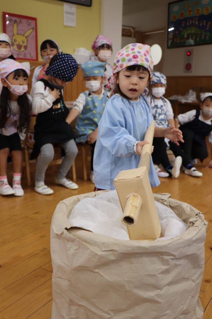 12月25日にお餅つきを行いました。当日は突風の為、屋外でのもちつきが出来ませんでしたが、先生たちの案で簡易的な臼と餅と杵が出来上がりました。餅つきをした後、本物の餅を自分たちで丸め、美味しく頂きました。口の周りが真っ白になりながら、美味しそうにお餅を食べる姿がとても微笑ましかったですよ。三角巾やエプロン等の準備、ありがとうございました。