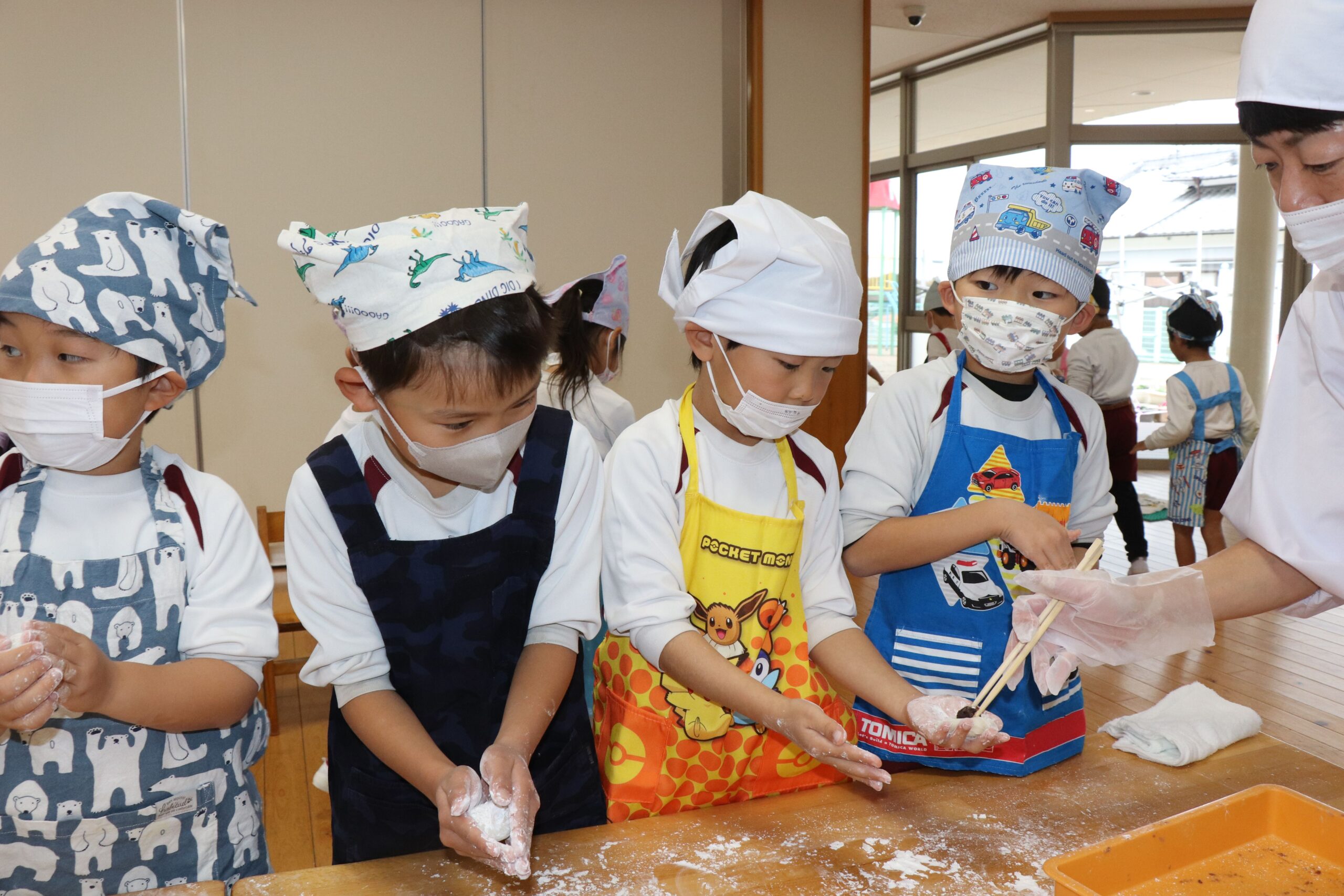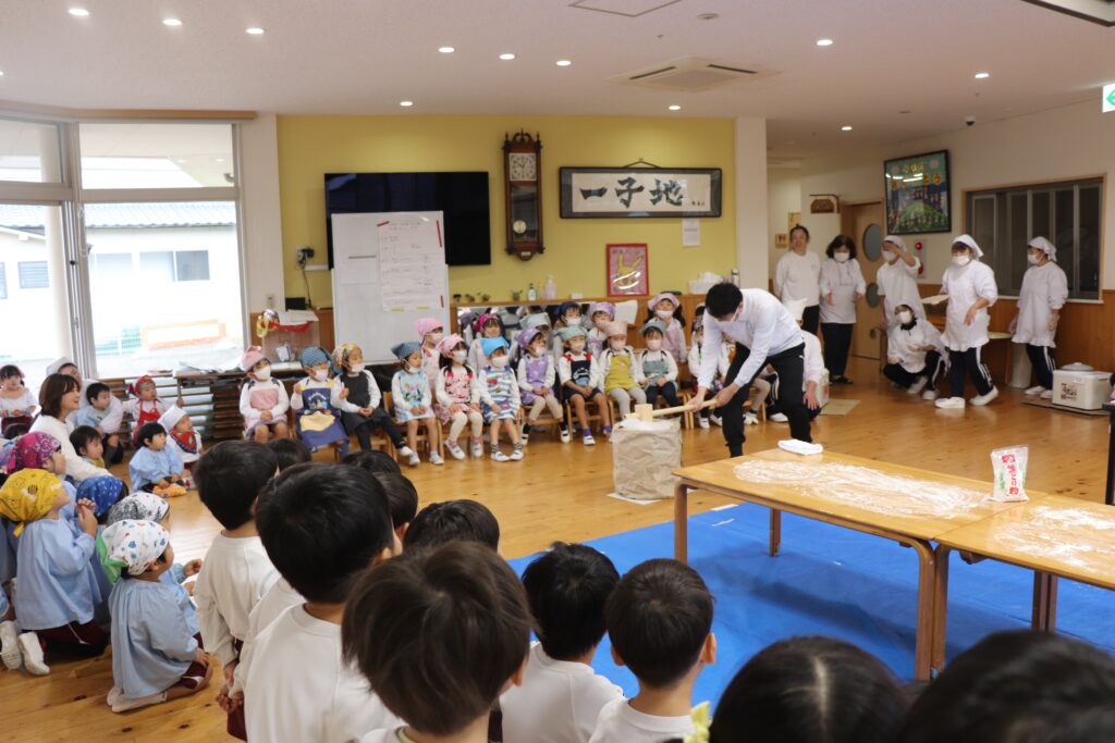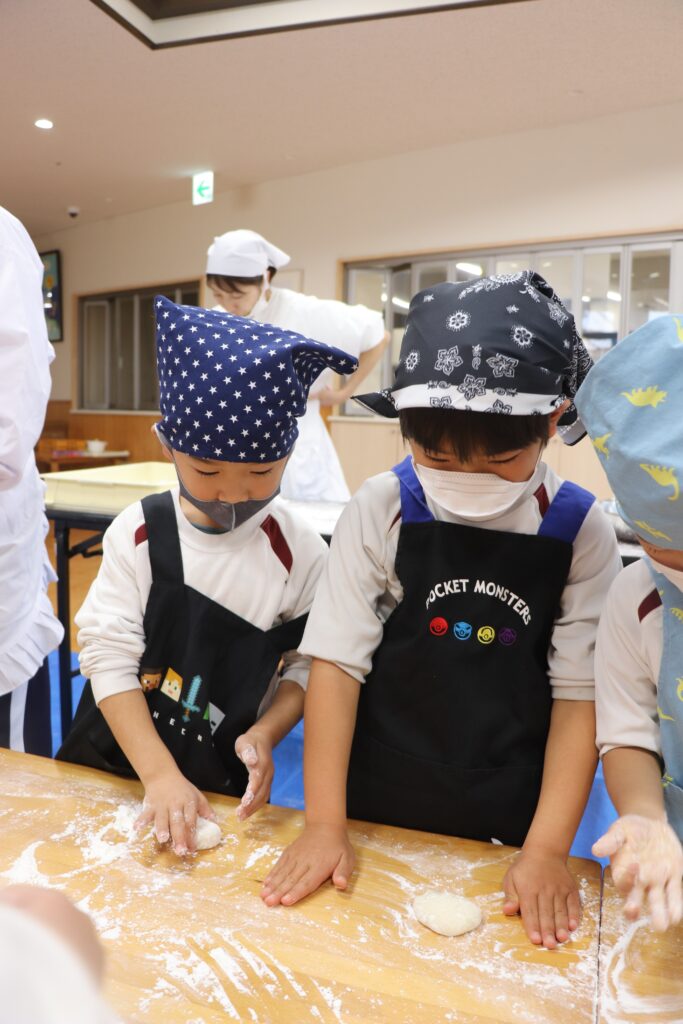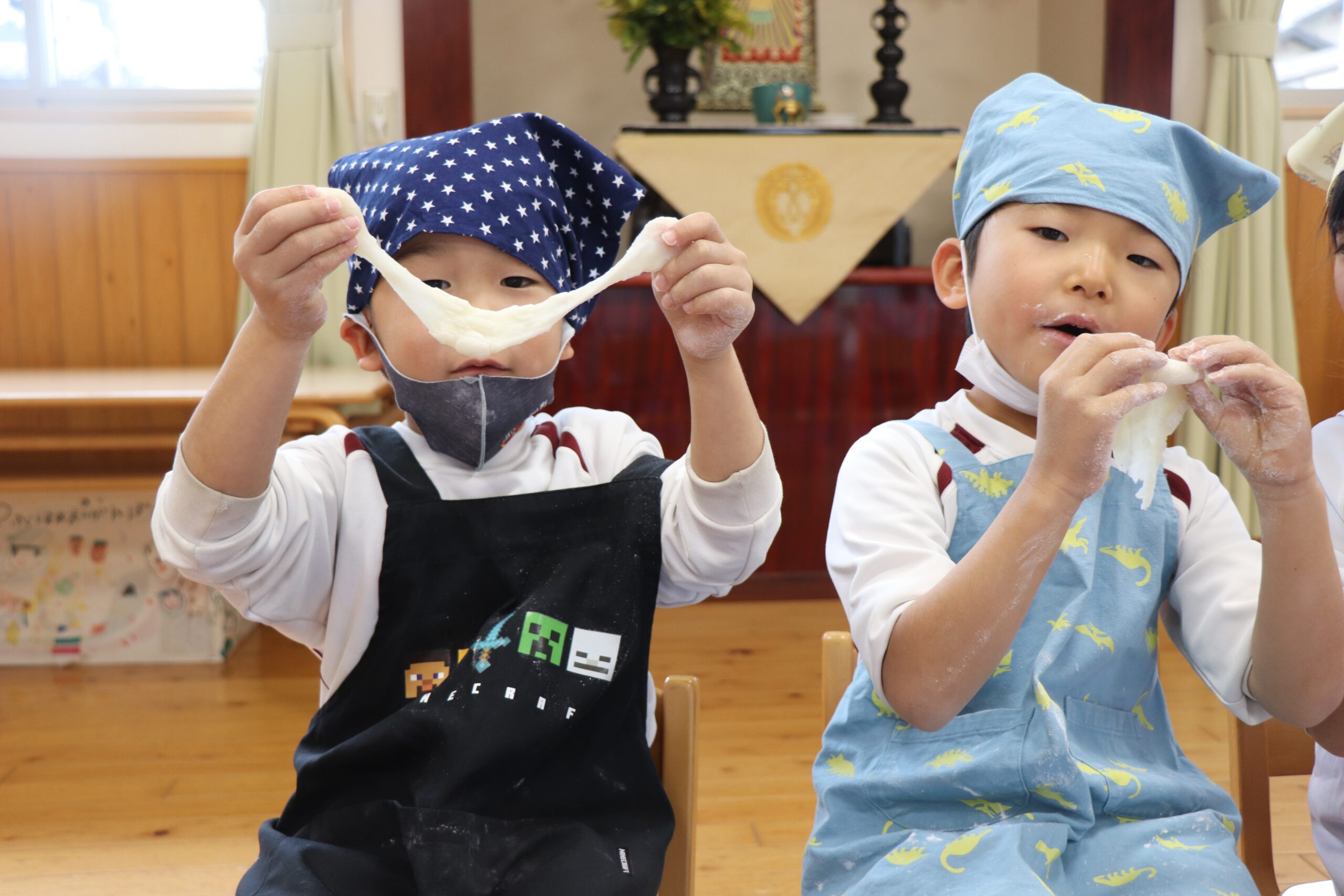 12月25日にお餅つきを行いました。当日は突風の為、屋外でのもちつきが出来ませんでしたが、先生たちの案で簡易的な臼と餅と杵が出来上がりました。餅つきをした後、本物の餅を自分たちで丸め、美味しく頂きました。口の周りが真っ白になりながら、美味しそうにお餅を食べる姿がとても微笑ましかったですよ。三角巾やエプロン等の準備、ありがとうございました。