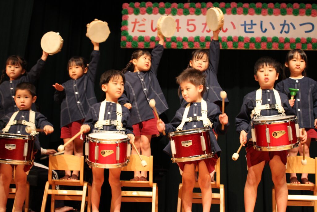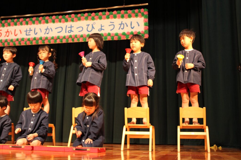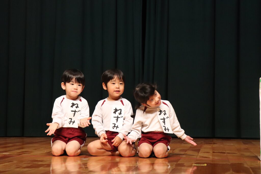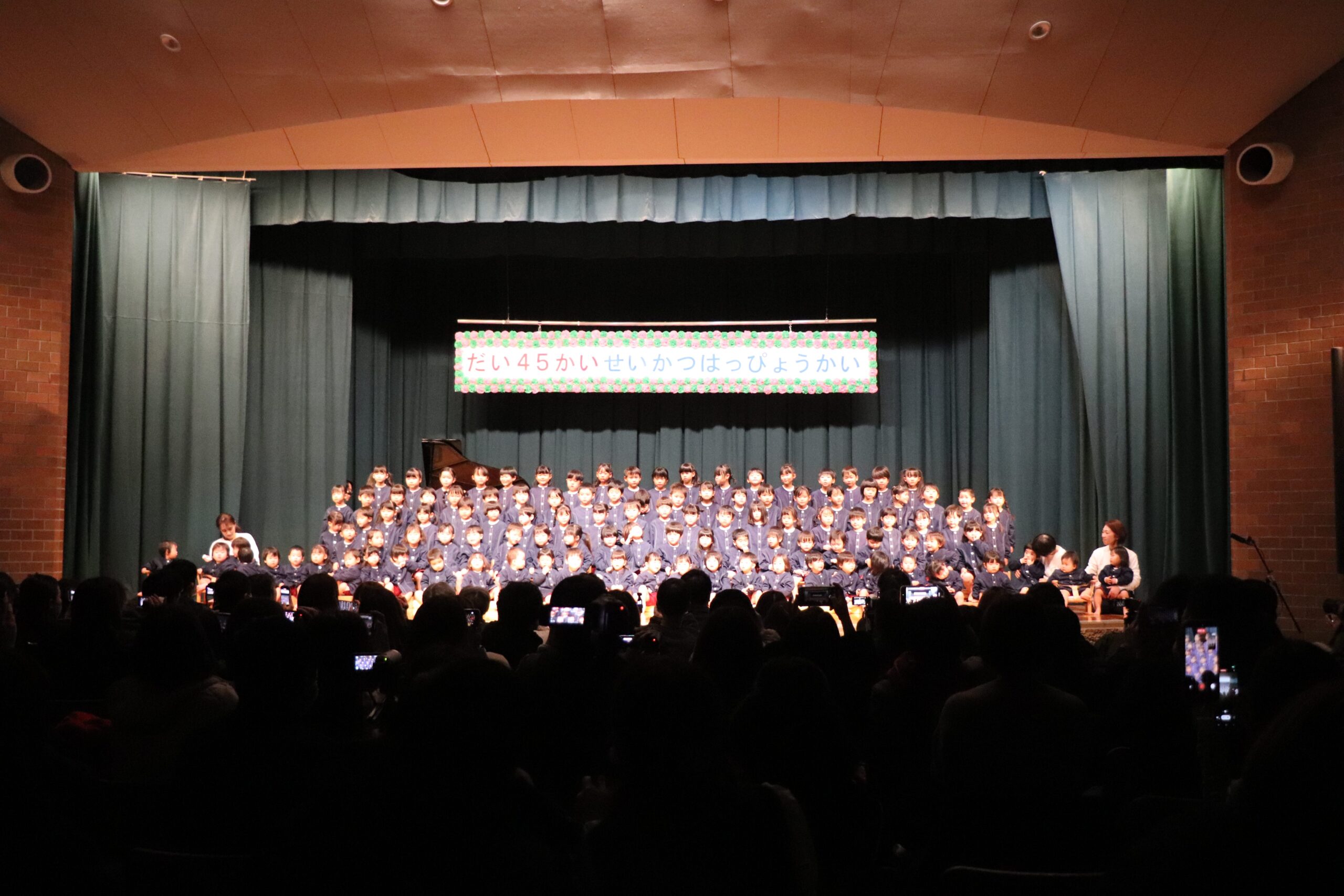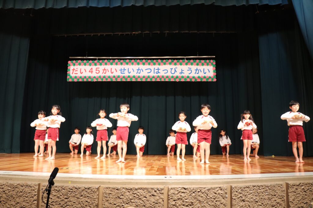 1月24日(土)に、第45回藤原こども園生活発表会が行われました。当日はとっても寒かったですが、子ども達は少し緊張しながらも張り切って会場入りしてくれました。幕が開くとたくさんのお客さんに少しびっくりしている子ども達の姿も見られましたが、音楽が流れるといつものように楽しく踊る姿や歌う姿が見られ、子ども達も達成感を感じることが出来ていました。