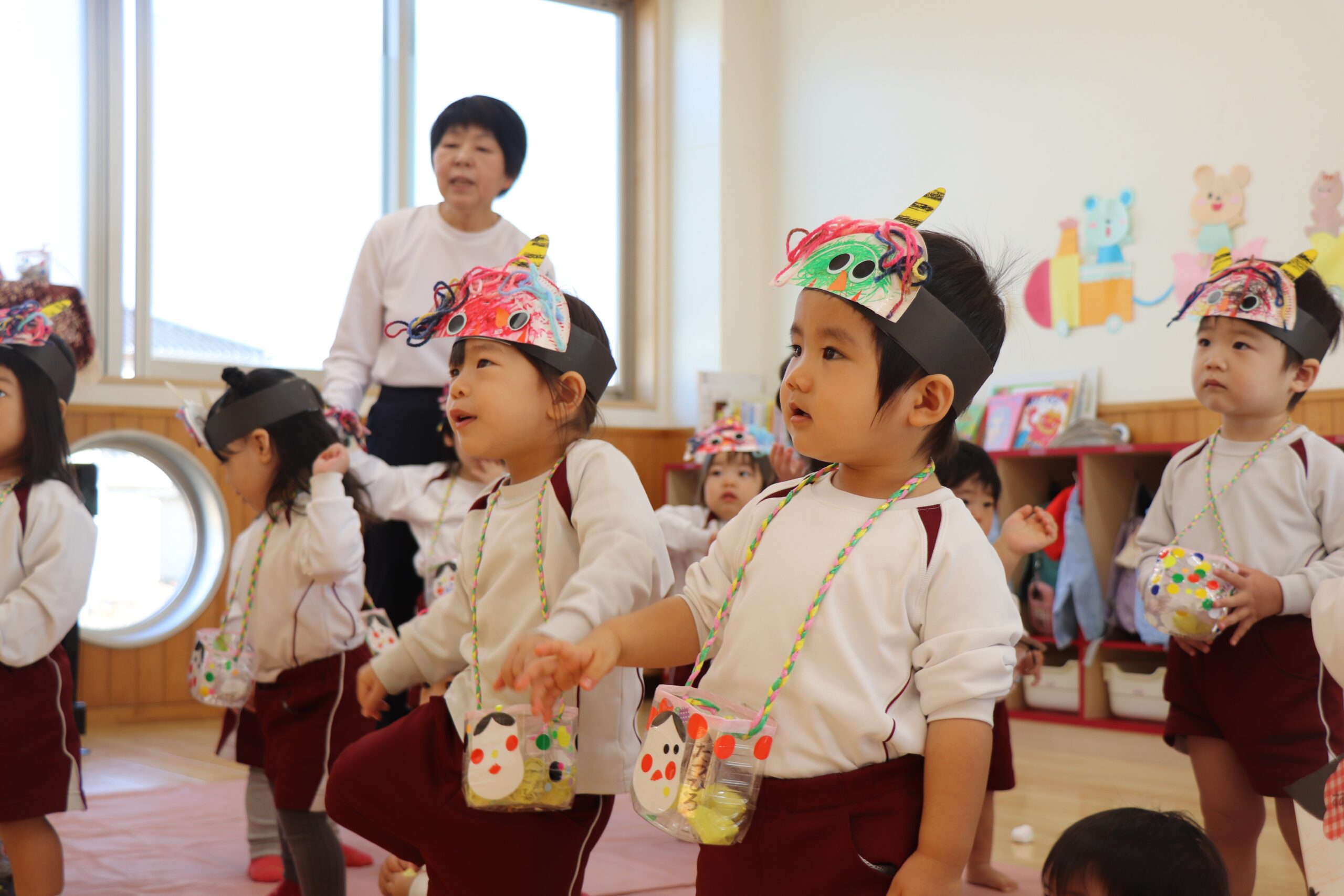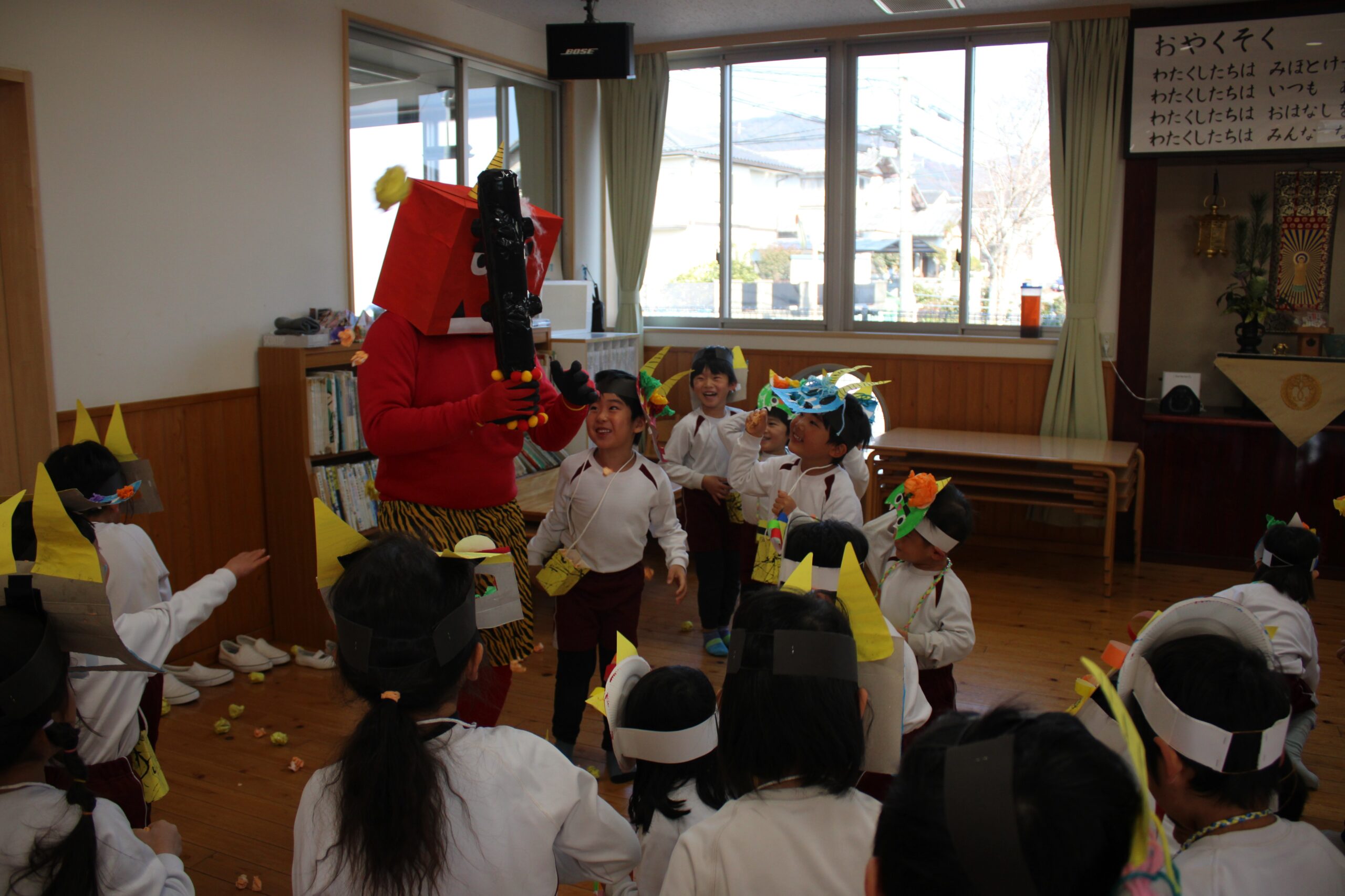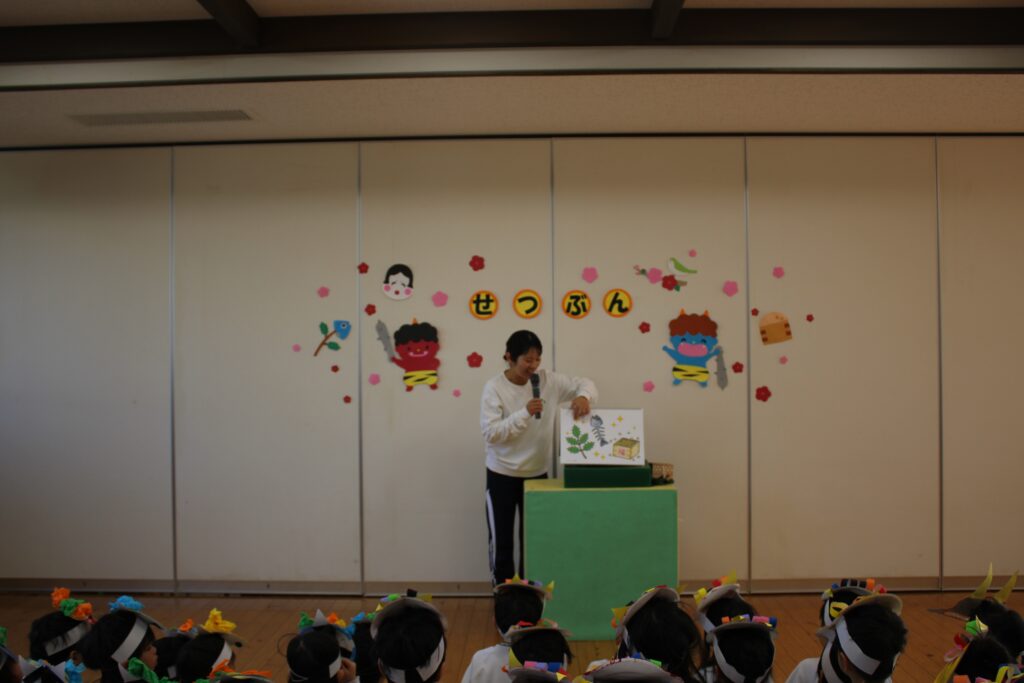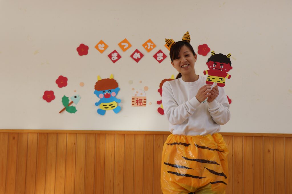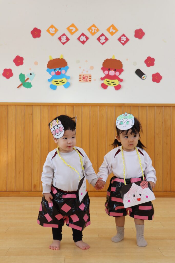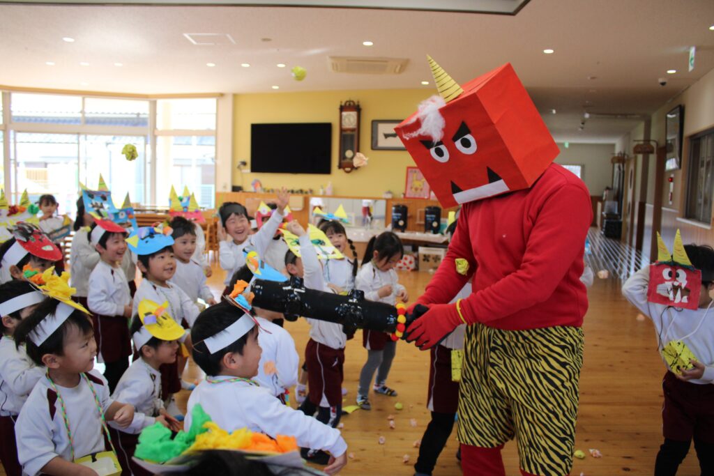 せつぶん 2026.03.09 2月3日は節分。園児は鬼のお面を作る時から話題は「鬼」!どこから来るのか?何色の鬼が来るのか?みんな想像を膨らませながら制作に取り組んでいました。当日は自分たちが作った鬼をかぶりランチルームに待機。赤鬼が登場すると小さいクラスを守るように鬼にめがけて豆を投げる年長さん!とっても頼もしかったです。