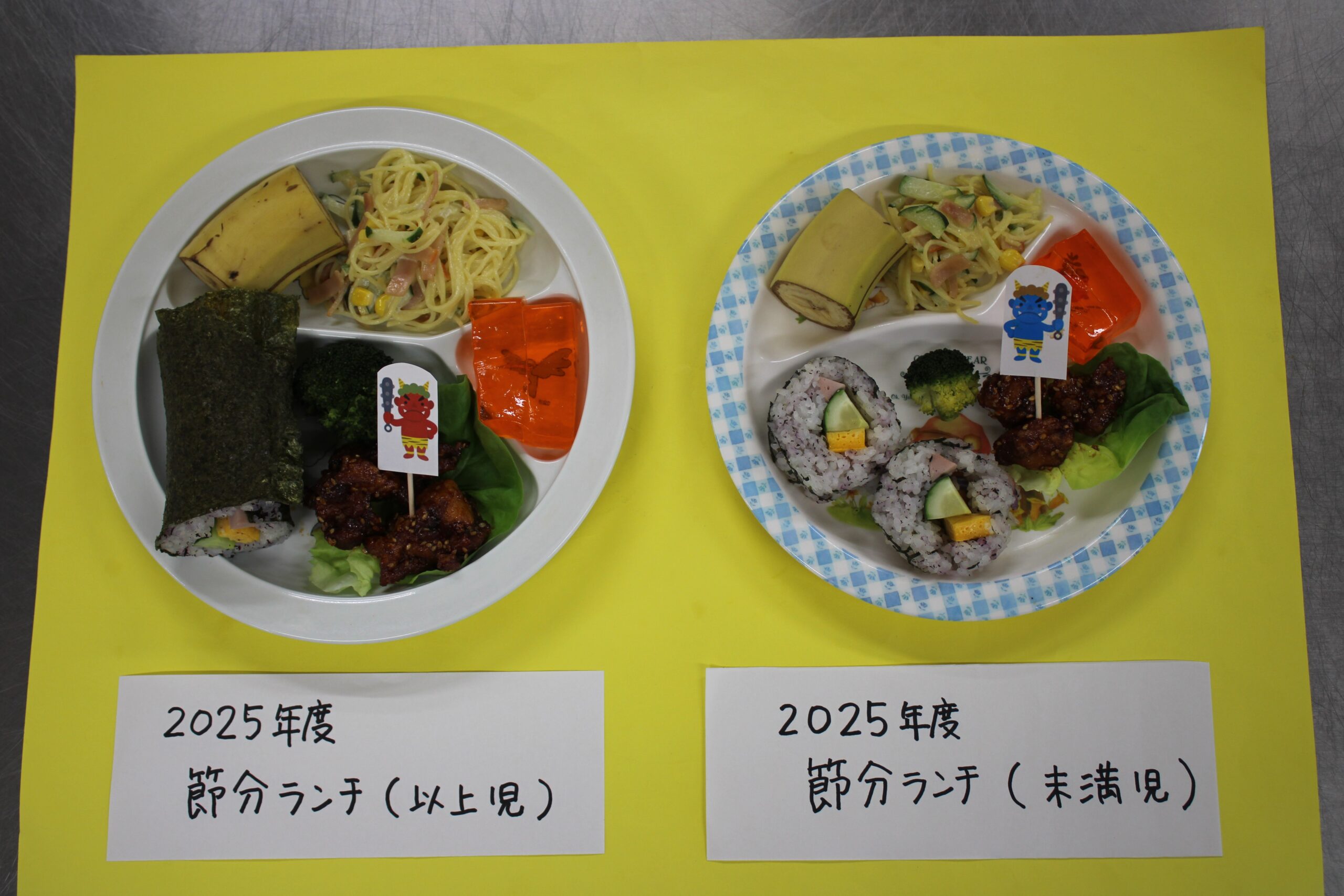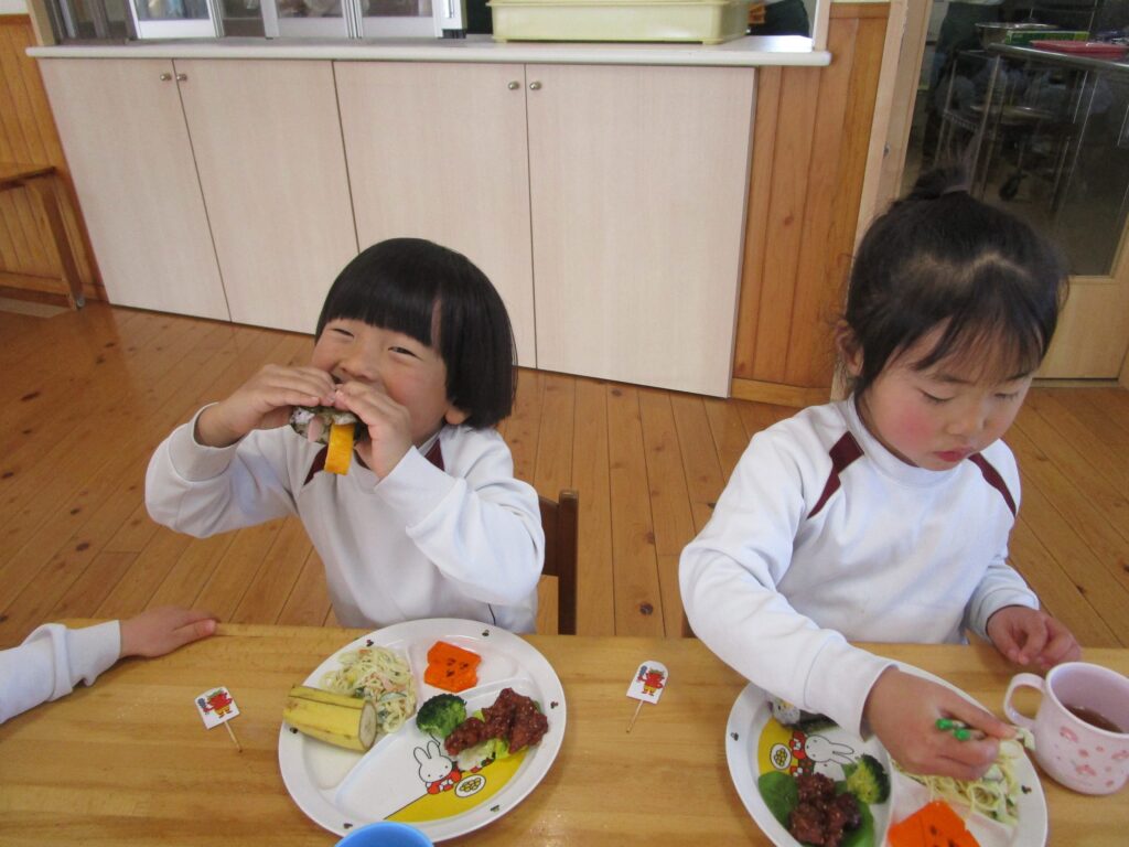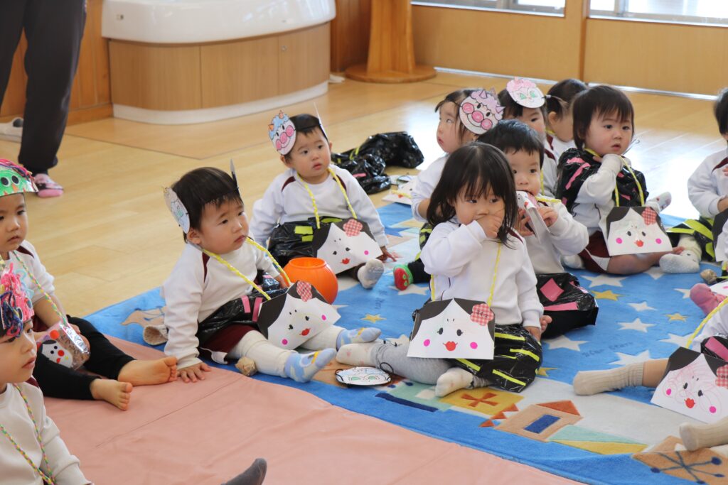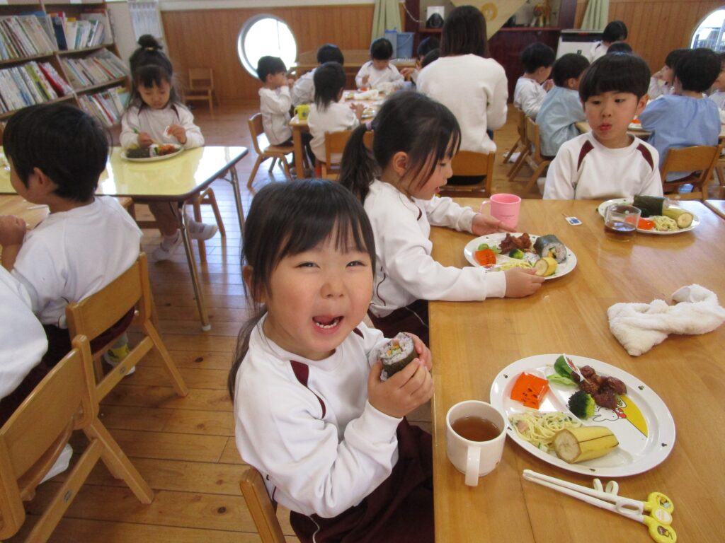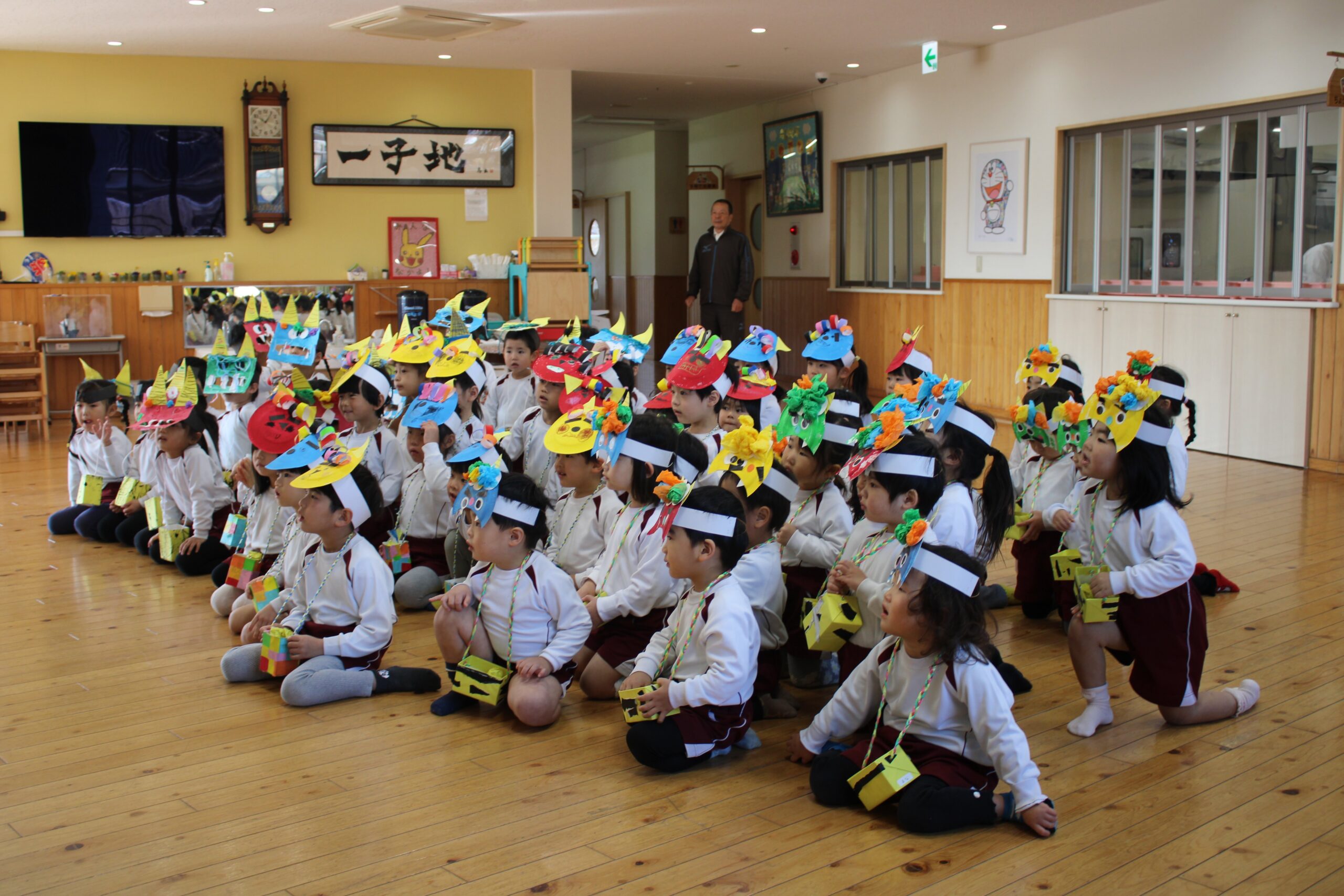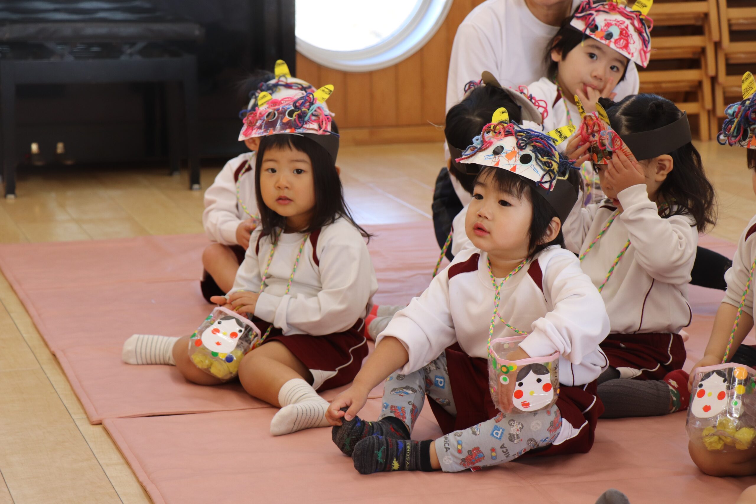 せつぶん 2026.03.09 2月3日は節分。園児は鬼のお面を作る時から話題は「鬼」!どこから来るのか?何色の鬼が来るのか?みんな想像を膨らませながら制作に取り組んでいました。当日は自分たちが作った鬼をかぶりランチルームに待機。赤鬼が登場すると小さいクラスを守るように鬼にめがけて豆を投げる年長さん!とっても頼もしかったです。